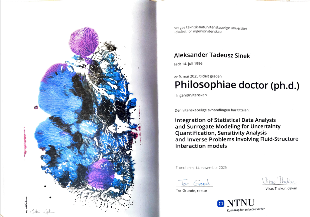 Praca doktorska była realizowana w trybie podwójnego doktoratu (PŚ-NTNU), w ramach której Norwegian University of Science and Technology (NTNU) w Trondheim nadał 9 maja 2025 r. Aleksandrowi stopień doktora nauk.